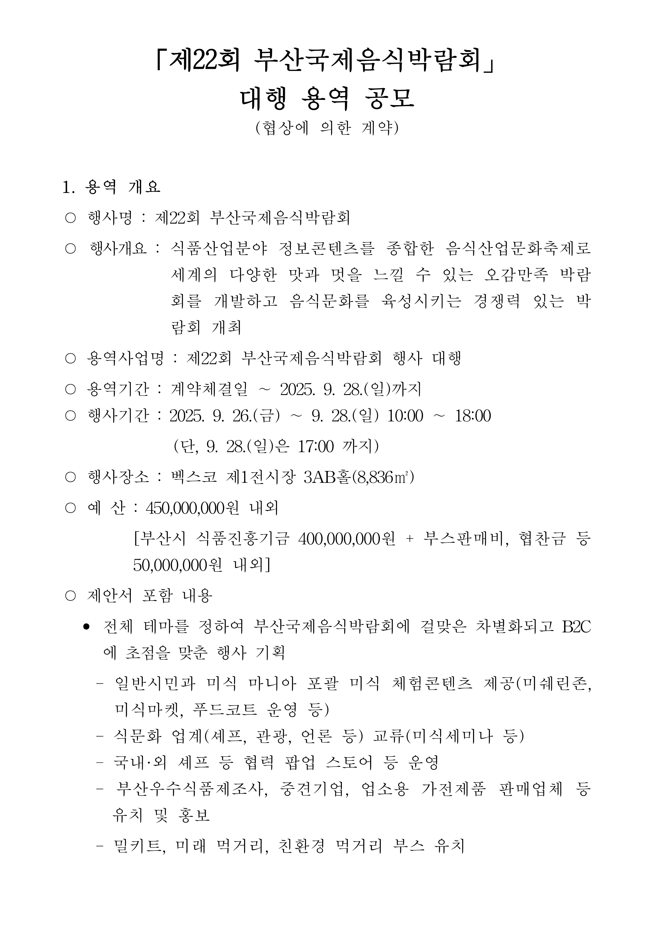 「제22회 부산국제음식박람회」 대행 용역 공모 공고