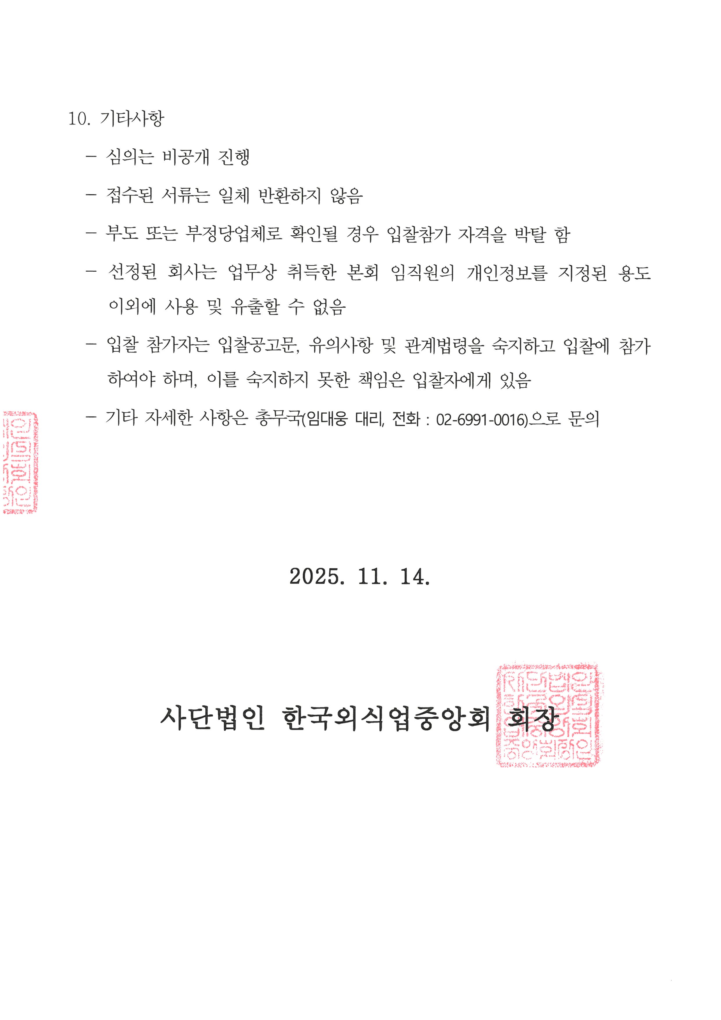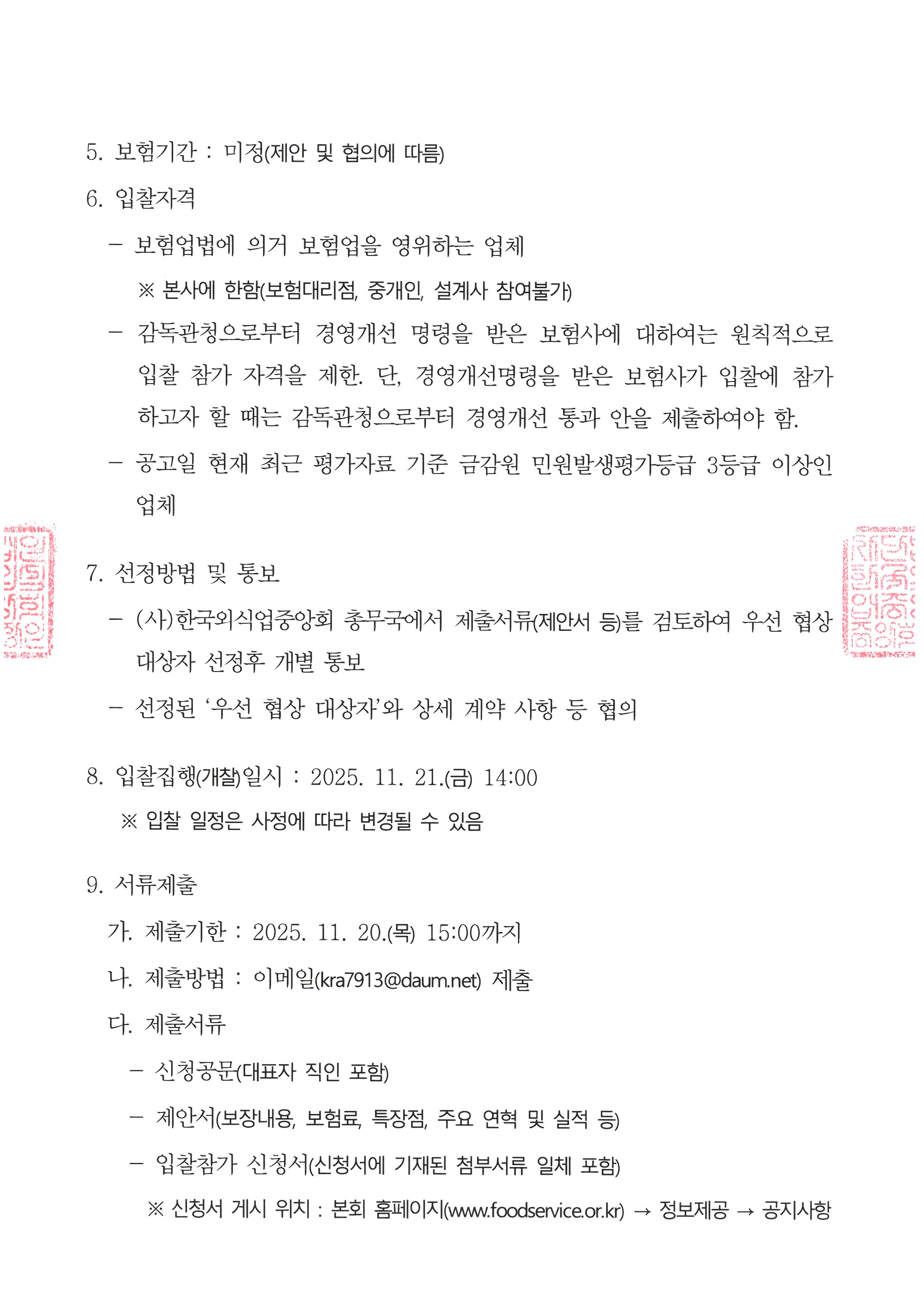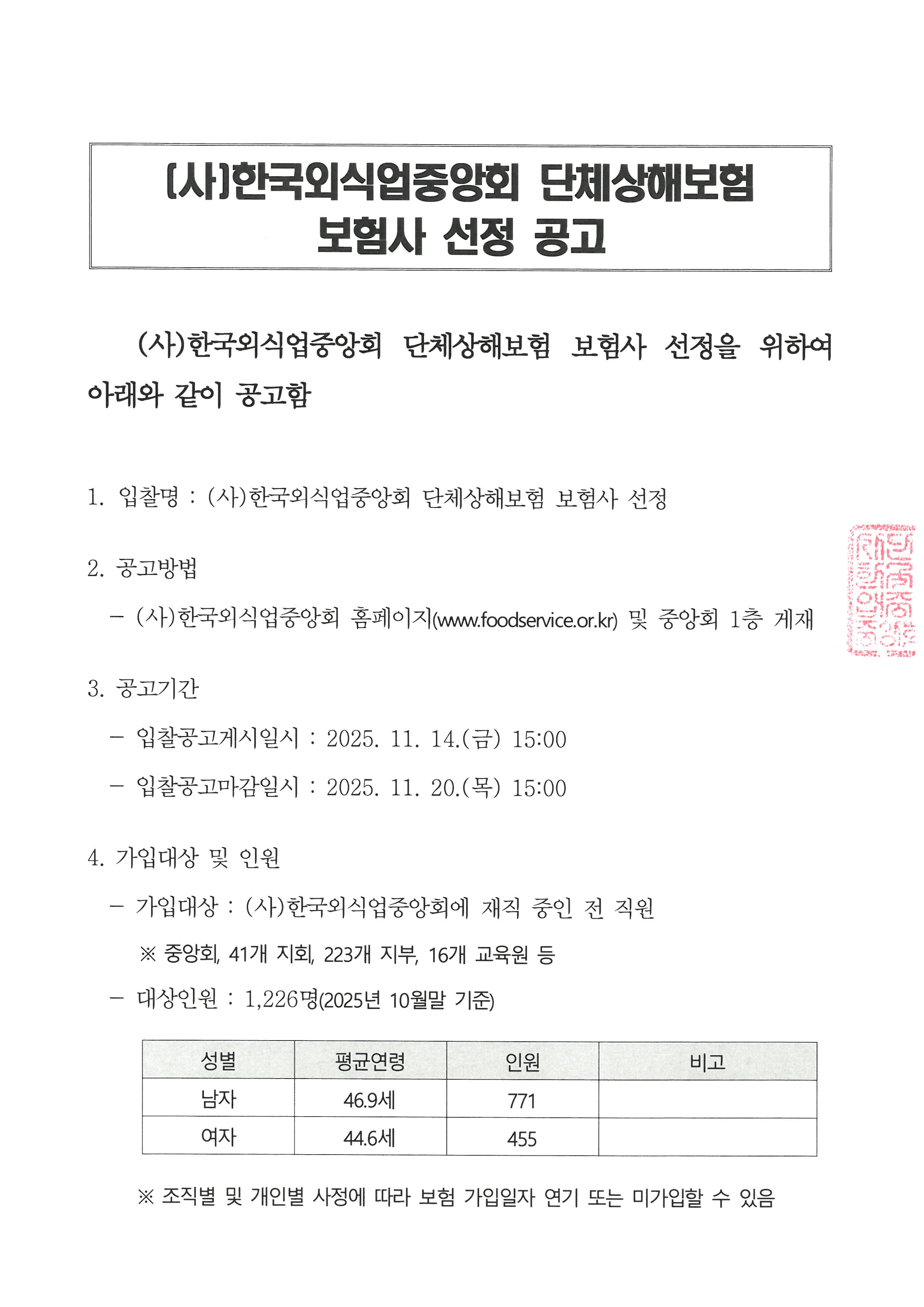 (사)한국외식업중앙회 단체상해보험 보험사 선정 공고